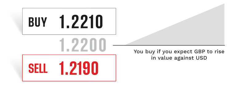 You’ll go long (‘buy’) on the spot price of a forex pair, if you expect the base currency’s value to rise against the quote. For example, if GBP/USD is trading at 1.2200, with a 1.2210 buy price and a 1.2190 sell price, you’d buy at 1.2210 since you expect GBP to rise in value against USD. You can also set a stop-loss to manage your risk.