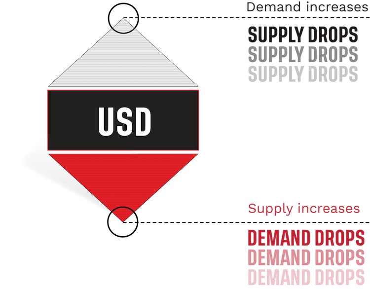 Supply is controlled by central banks, who can announce measures that will have a significant effect on their currency’s price. Quantitative easing, for instance, involves injecting more money into an economy, and can cause its currency’s price to drop.